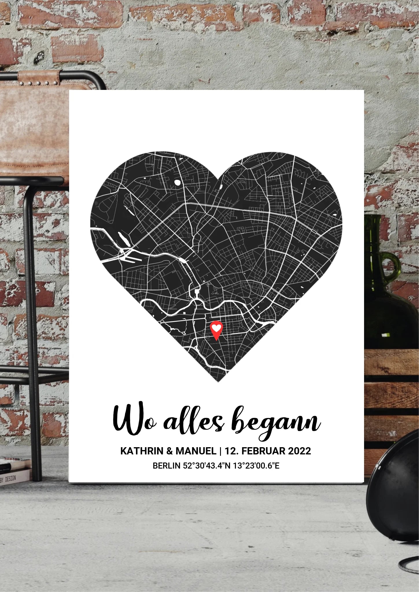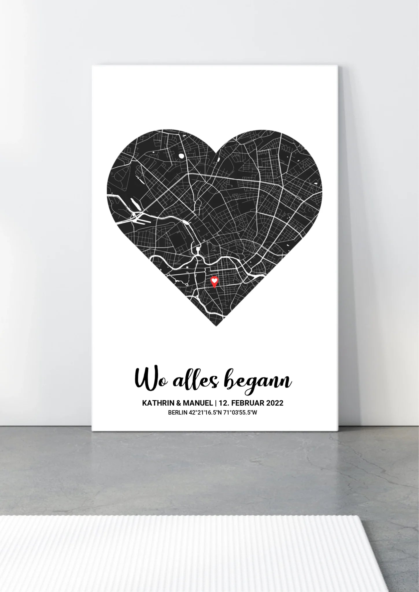 Willst du etwas ganz Besonderes, das dich an den Tag erinnert, an dem eure Beziehung begann? Etwas, das ein aussagekräftiges Statement in eurem Zuhause abgibt und euch an ein bedeutendes Ereignis in eurem Leben erinnert? Die personalisierte "Wo alles begann"-Leinwand ist die perfekte Art, eure Liebe zu feiern!